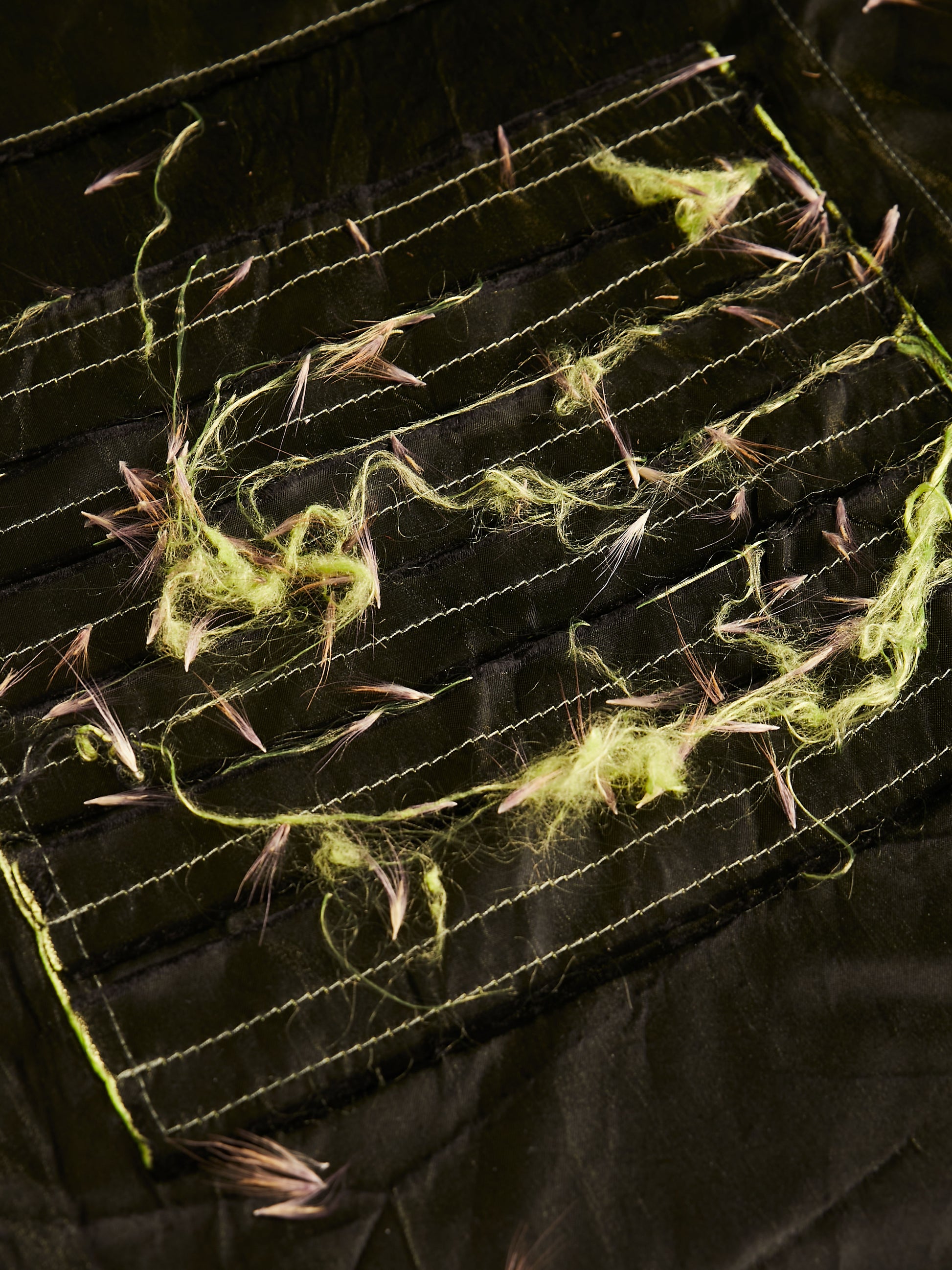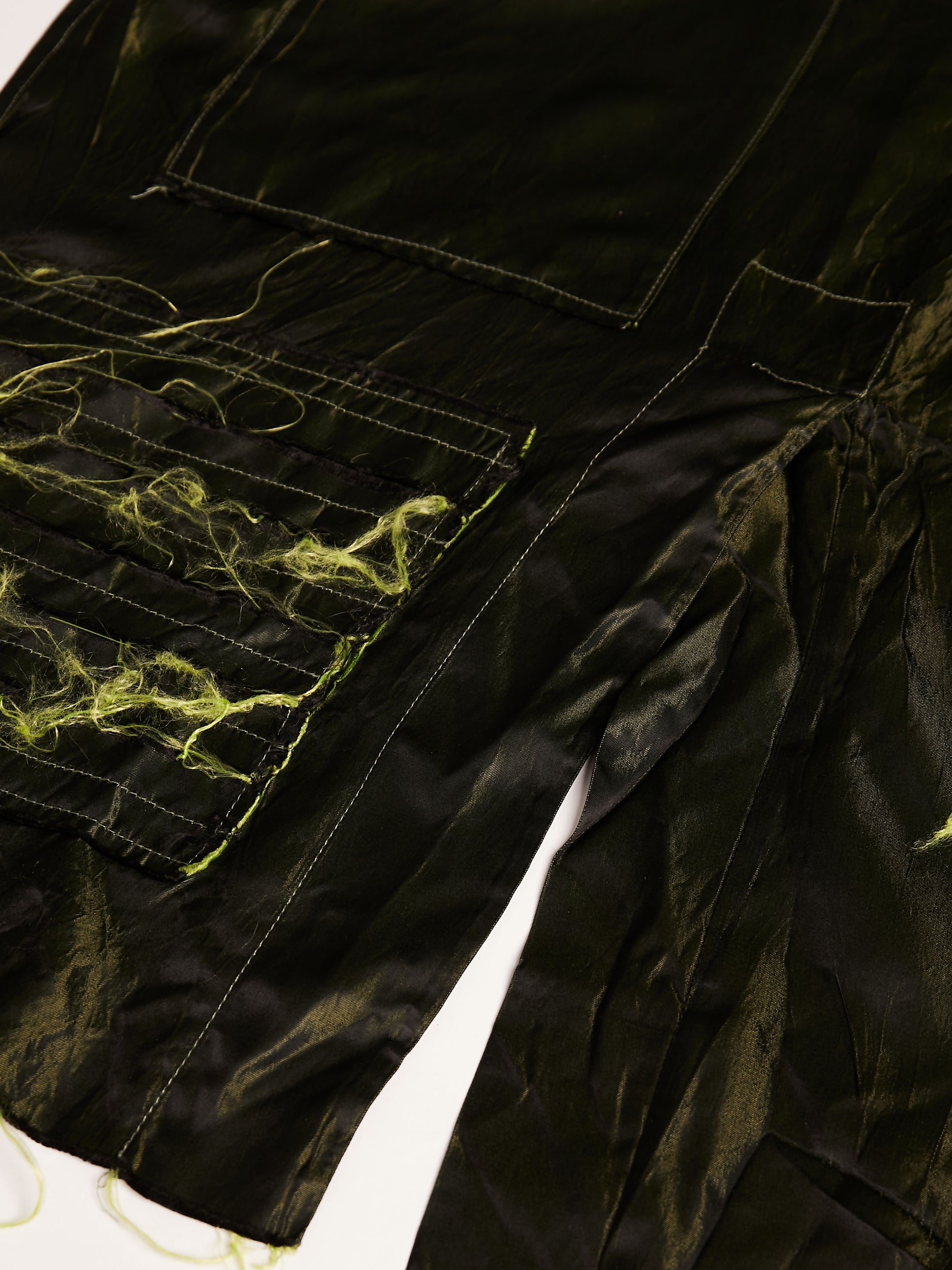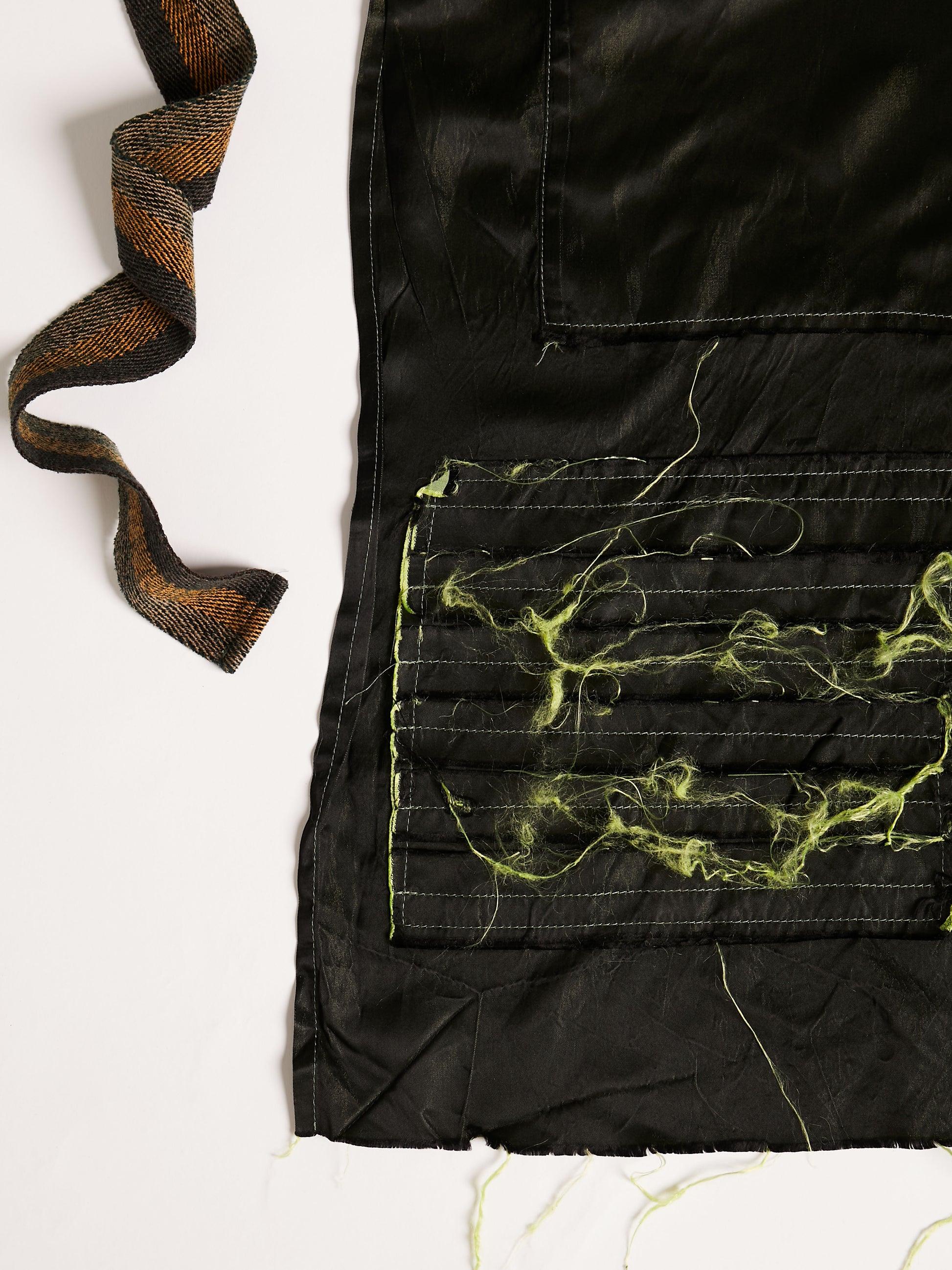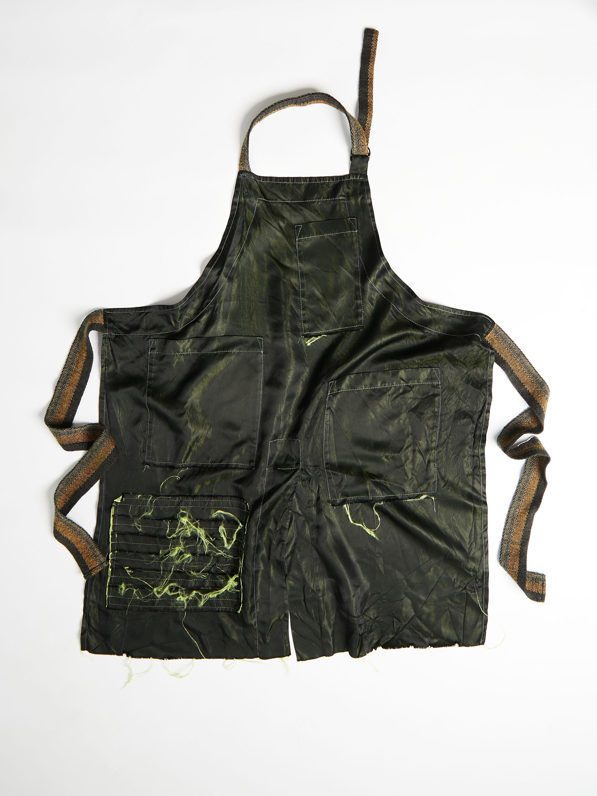 An apron made of double weave silk chiffon with three pockets, a patch of unfinished hems to wipe your hands on, and a deep slit up the middle so the wearer can move freely.